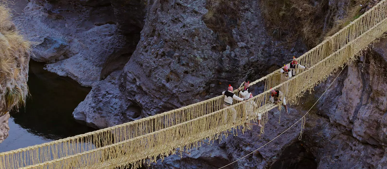 Al llegar a «Q’eswachaka» (Qeshuachaca), exploraremos su puente ancestral, legado de una tradición milenaria que abarca arte, arquitectura y cultura en el mundo andino. Este emblemático puente se erige sobre el majestuoso Río Apurímac en la provincia de Canas. Dado que el material (paja) del último puente Inca se deteriora anualmente debido al clima de la sierra, requiere mantenimiento cada junio, lo cual implica una reconstrucción total. Estos días se convierten en celebraciones para las comunidades locales, reflejando una antigua costumbre.